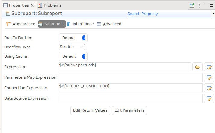 위 스크린샷 처럼 Detail밴드에 추가된 subreport를 클릭을 하면 우측 Properties의 Subreport탭에 Edit Parameters 버튼이 보이는데