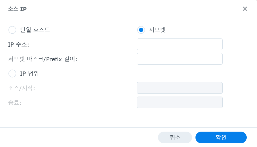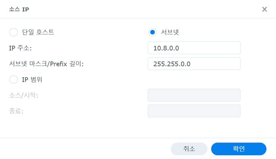 위에 소스IP 화면에 서브넷으로 선택을 하고 아래처럼 IP주소를 10.8.0.0 서브넷 마스크를 255.255.0.0 으로 입력 하면 된다. 만약 VPN에 ip 대역이 X.0.0.0 ~ X.0.0.255 라고 하면 서브넷 마스크는 255.0.0.0이 된다.