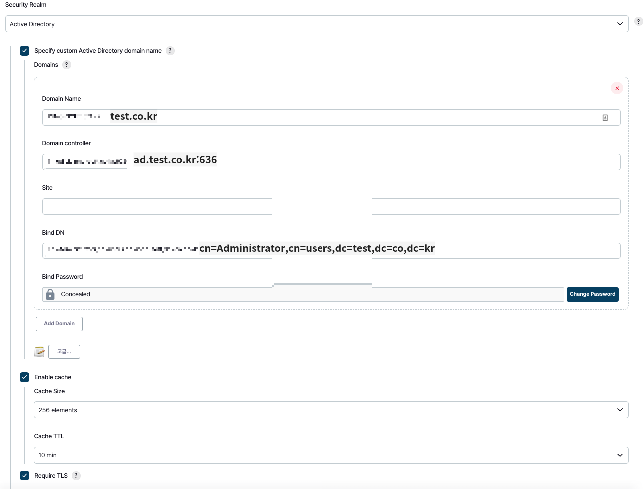 AD tree 상의 DN을 적어줘야 한다. 그리고 Bind Password에 Change Password 버튼을 눌러서 관리자 비밀번호를 입력해 줘야된다.